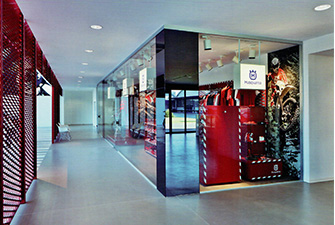在Husqvarna摩托車總部,寶馬集團決定委任Buratti+Battiston建筑設(shè)計團隊來設(shè)計他們的新展廳。新建筑坐落在街道的一旁,用兩層高的全透明的玻璃墻打造。議會室、專賣店、摩托車的陳列室也可兼作老式摩托車的展覽廳。這個展廳主要是以紅色網(wǎng)格狀的金屬材質(zhì)打造,使展廳被一層一層的“面”包裹著,遠(yuǎn)觀會留給人留下非常深刻的印象。